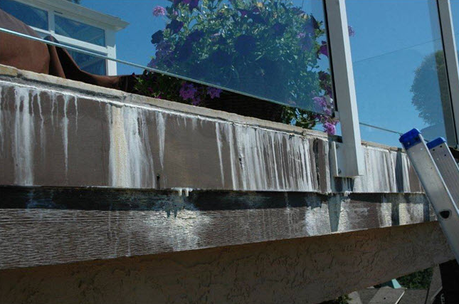 Within the first 12 months from completion of the work, calcification or efflorescence caused by water coming from a deck or balcony that occurs on walls below or beside the deck or balcony, or that appears in the mortar joints of the deck or balcony tiling, is a defect.