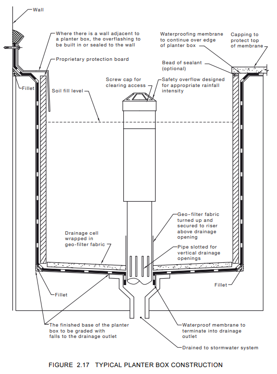 The base of the planter should be graded, or “fall,” toward the waste outlet. Correct falls ensure that water does not pool at the bottom, which could compromise the waterproofing membrane over time. Ensuring proper falls is a simple but crucial step that significantly contributes to the longevity of the structure.